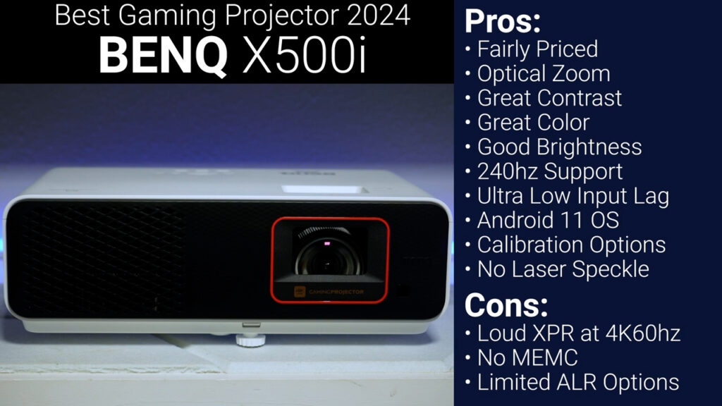 No matter what your budget is, the BENQ X500i seems to be the best gaming projector on the market with the ViewSonic X2-4K close behind, and looking at the projectors themselves and their stats I actually wouldn’t be surprised if they had almost the exact same internal parts. That said, the BENQ seems quite a bit more polished from a software and tuning perspective and it also includes BENQ’s QS02 streaming stick which has full Android TV 10 with Netflix support, while ViewSonic’s smart OS platform is basically worthless. So, if you can get past the XPR motor noise at 4K 60Hz the X500i is not just the best gaming projector, but probably the best all-around projector I’ve ever tested.