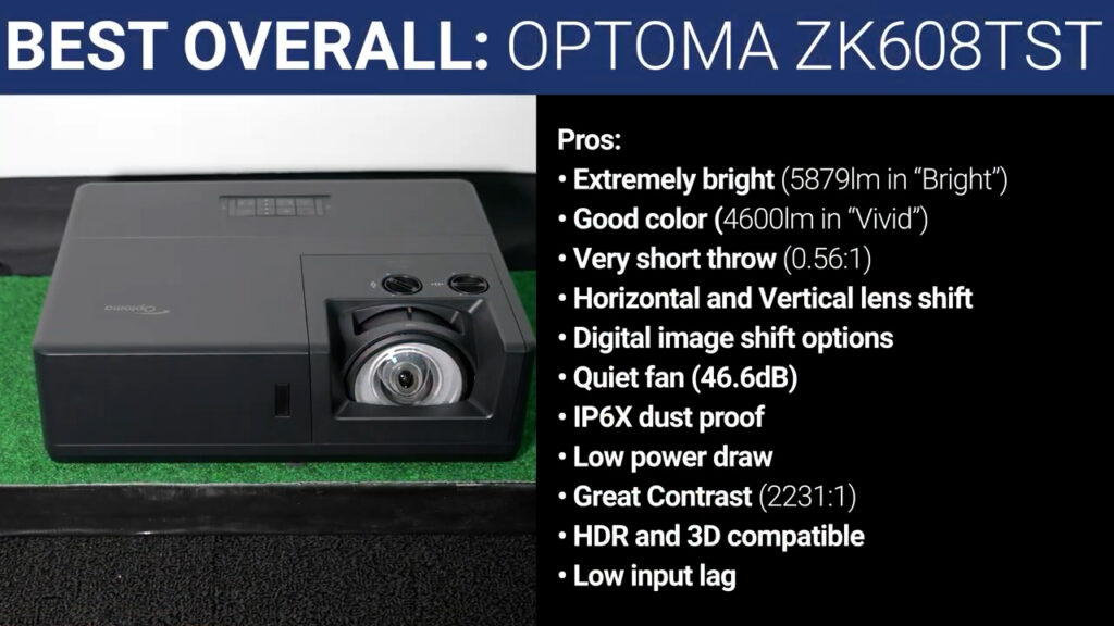 The new Optoma ZK608TST is the best all-around golf sim projector money can buy. It’s got 5879lm of peak brightness in “Bright” mode with less than ideal but still usable color accuracy, and 4600lm in “Vivid” mode with vibrant and accurate colors. It has one of the shortest throw distances I’ve ever seen as well as optical lens shift and digital image shift. It’s quiet, dust proof, has a relatively low power draw for its brightness, a very high native contrast ratio, supports HDR content and 3D, has low input lag, and it’s just barely larger than a typical home theater projector. The only downsides I can see are that it doesn’t have any optical zoom and at $5999 it’s not going to fit most people’s budget.