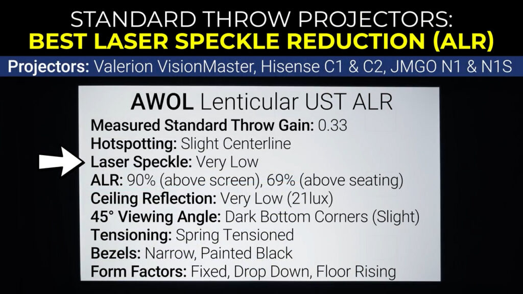 If you want to reduce the laser speckle of your triple laser projector to almost zero while gaining the benefits of an ambient light rejecting screen, then I think the best screen material is a lenticular ALR screen made for ultra-short throw projectors. While I think standard throw lenticular screens could be a great product in the future, the current generation just doesn’t seem to perform as well as it should and isn’t available in as many form factors. Compared to the new standard throw lenticular screens, the UST versions have less hotspotting, less laser speckle, better uniformity, and are available in significantly more form factors.