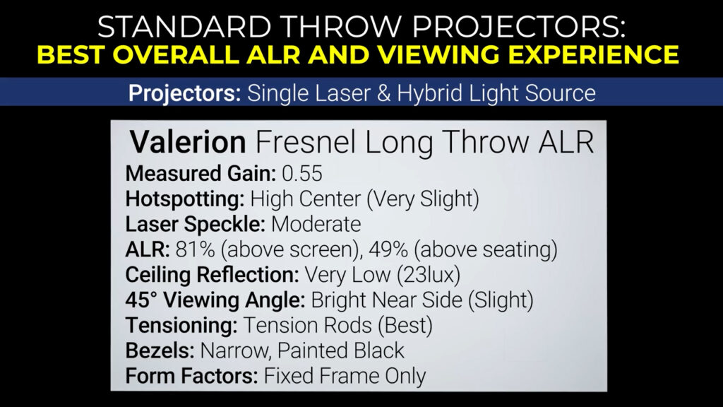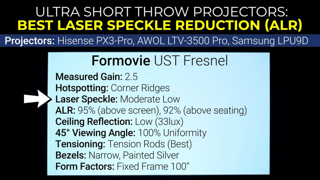 If you’re looking for an ALR material, the Formovie Fresnel screen is the best at reducing laser speckle to a moderately low amount while maintaining extremely high brightness and rejecting between 91% and 95% of ambient light depending on the source, and in all my testing and having personally used the Formovie Fresnel for the last two years it basically only has two weaknesses. First, it’s only offered in 100” fixed frame, which I know is a huge dealbreaker for some spaces, and second, in certain very bright scenes you can notice the circular Fresnel structure in the top corners of the screen. It’s never been enough to bother me, but it’s something to be aware of.