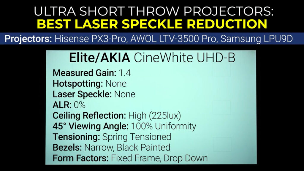 For ultra-short throw projectors with pure RGB laser sources like the Hisense PX3-Pro and AWOL LTV-3500 Pro, you’ll want a screen that reduces laser speckle, and like the long throw projectors, Silver Ticket’s Woven WAB material reduced the laser speckle to zero, but the texture of the screen was clearly visible with the steep projection angle of the USTs, and definitely caused image degradation. The next lowest amount of laser speckle was from the Cinewhite UHD-B material, which also has the benefit of nearly perfect screen uniformity and wide viewing angles.
