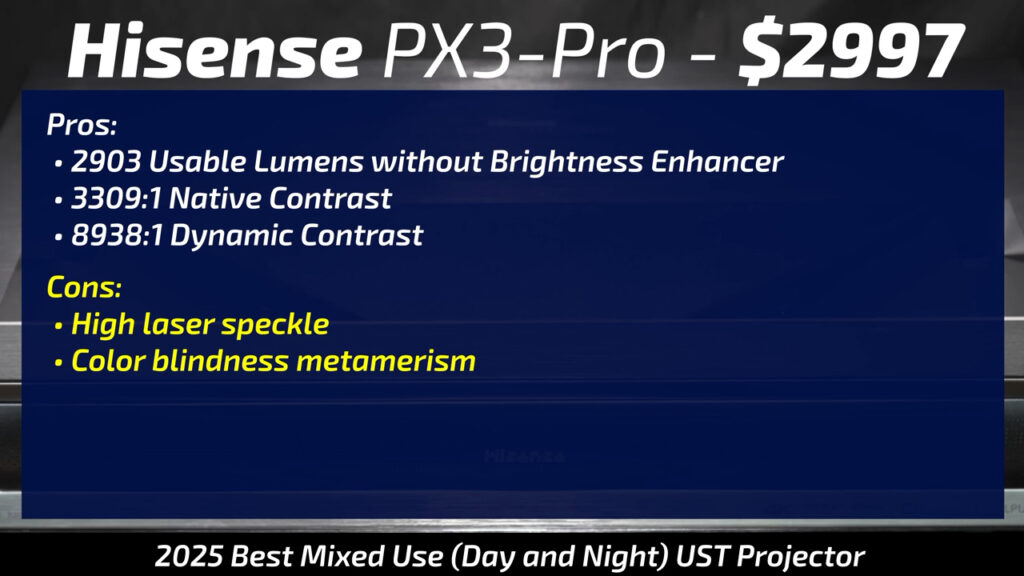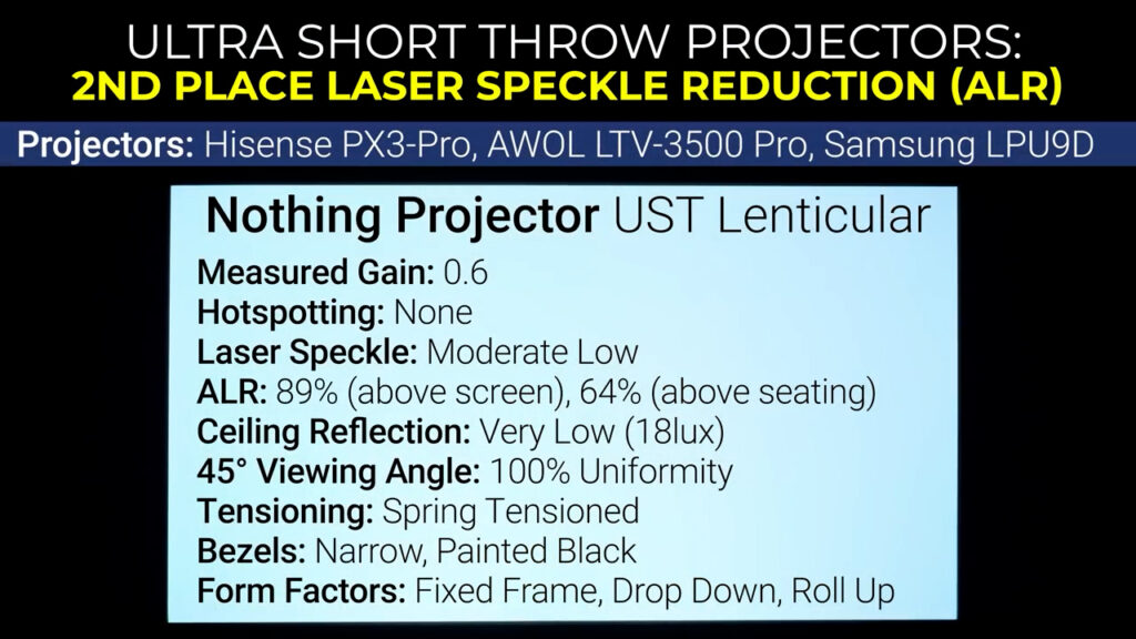 If you need a drop down or floor rising screen or one that comes in sizes over 100”, then a low gain lenticular screen seems to be the best at reducing laser speckle. In this video that meant that the Nothing Projector 0.6 gain screen was my 2nd place pick for my Hisense PX3-Pro.