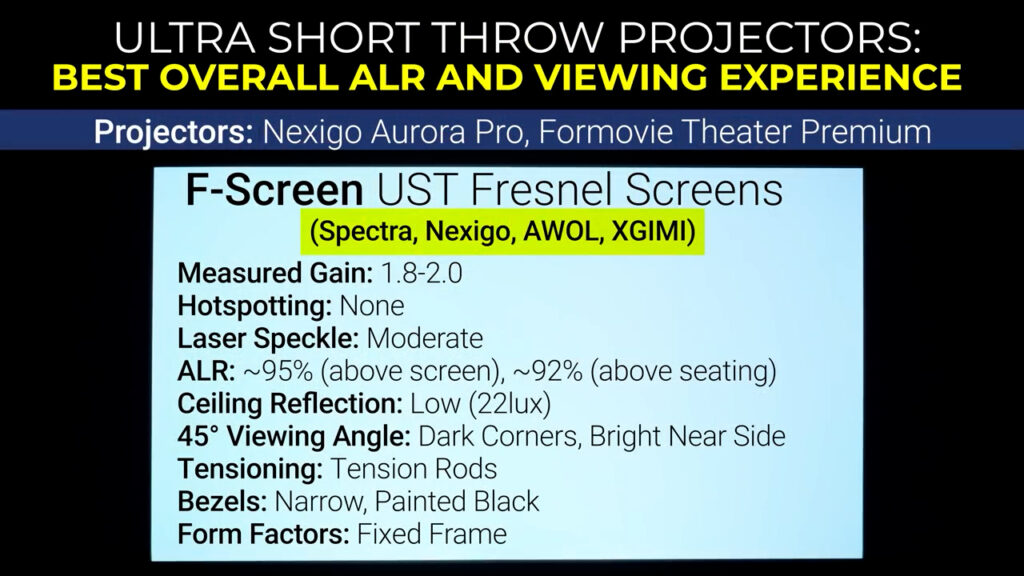 If your ultra short throw projector has an ALPD light source like the Nexigo Aurora Pro or Formovie Theater Premium, then you don’t need to be as concerned about laser speckle. I thought that the Fresnel screens from Spectra, Nexigo, AWOL, and XGIMI, which are all essentially identical, had the best all-around performance with great build quality, huge amounts of ambient light rejection, and no visible Fresnel structure. They have the added benefit of coming in both 100” and 120” and often getting offered as a bundle with a projector purchase which can save you a lot of money.