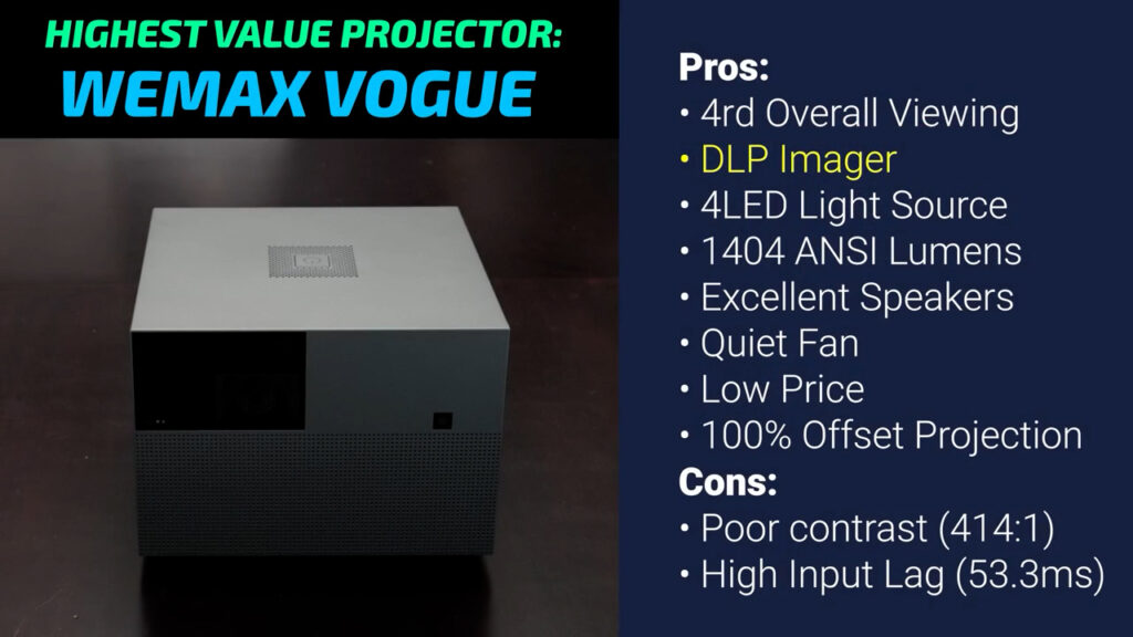 If contrast isn’t your end-all be-all stat, I feel 100% confident saying that the Wemax Vogue is WAY more projector than you would typically be able to get for your money. A DLP projector with a 4LED light source putting out 1404 measured ANSI lumens for $423 new just doesn’t line up with the rest of the market, and similar projectors from Dangbei and XGIMI are in the $700-800 range. In addition to the more robust DLP projection system, the Wemax’s built-in speakers were also in a completely different league with loud, balanced, full range stereo sound. The Wemax also has the advantage of projecting with 100% offset, which means it’s easier to mount on the ceiling or project from a table, and if you do need to position it to the side of your screen, the DLP projection system maintains better focus uniformity when using keystone. It also had a fan noise of just 37.4 decibels when outputting its full 1404 lumens and it drew just 152.3 watts for an efficiency of 9.2 lumens per watt, by far the highest in the video. If the Vogue had decent input lag it would be the easiest recommendation I’ve ever made, but at 53.3 ms it’s not quite as tempting since it’s not great for gaming.