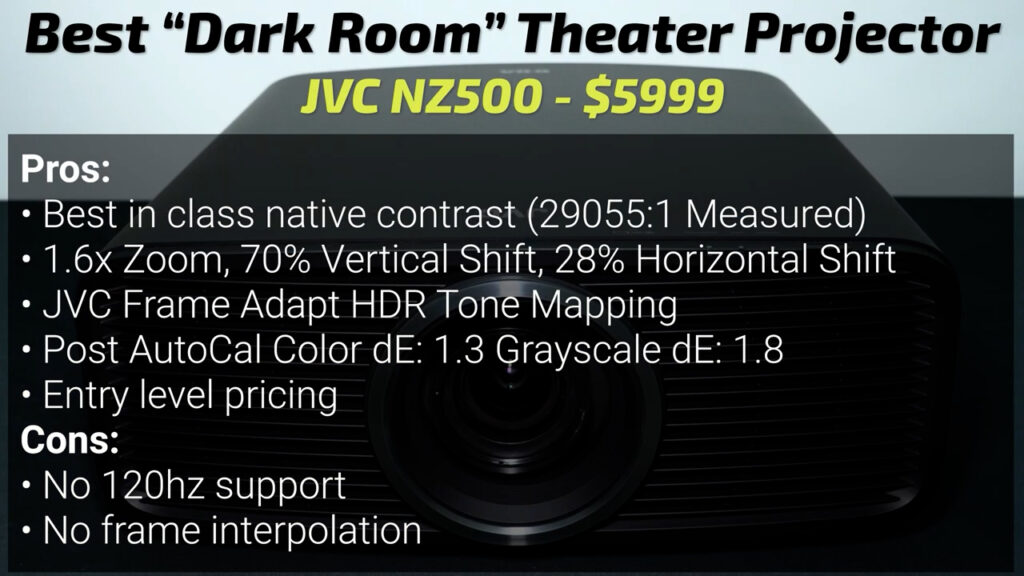 For a traditional dark room theater with dark colored walls, ceiling, and carpet, JVC has always been the king of black levels, and the NZ500 is no exception. With a native contrast ratio over 29000:1 without any laser dimming tricks, tons of zoom and lens shift options, and excellent tone mapping and color accuracy, the NZ500 has all the markings of a traditional high end home theater projector at a fraction of the price.