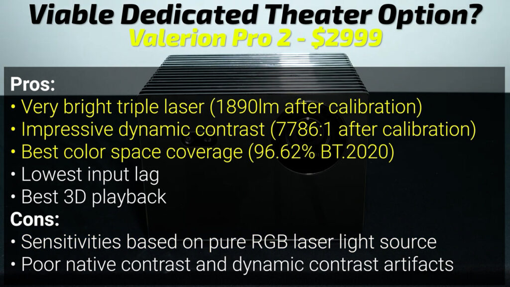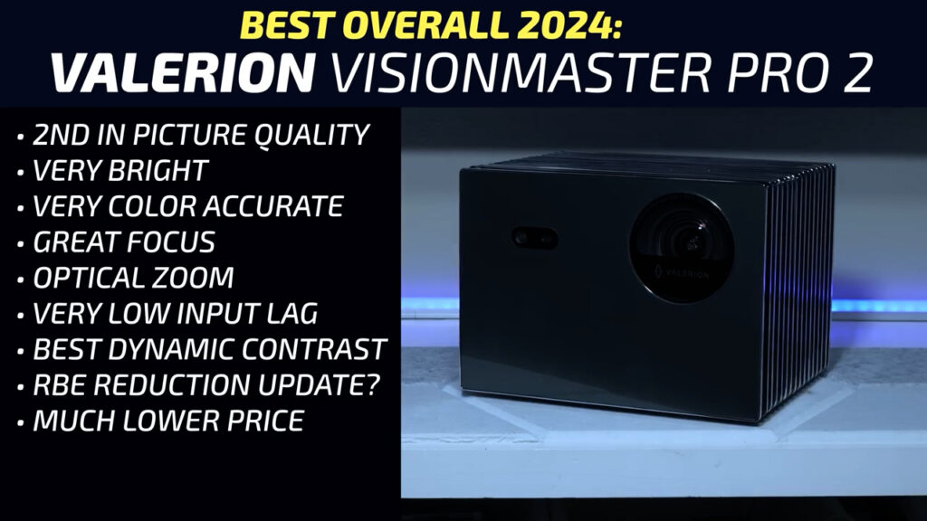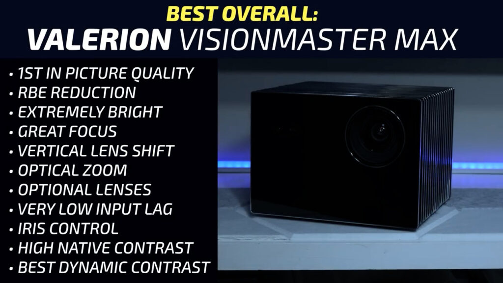 The Valerion Vision Master Pro 2 has basically no weaknesses. I’ve reviewed hundreds of projectors, and I can usually find something wrong with them, but other than some maybe overzealous contrast claims that are only achievable with full black and white patterns, the Valerion is absolutely exceptional. In 2024, the Valerion had the highest usable brightness, the highest color accurate brightness, the second highest native contrast, and by far the highest dynamic contrast. It covers 99.5% of the DCI-P3 color space with an SDR color accuracy of 3.12 average delta error. It supports 24p, all types of 3D, Dolby Vision, and IMAX enhanced, it has exceptionally low input lag, 1.2x optical zoom, great clarity, great auto focus and keystone, a built in aiming kickstand and optional gimbal mount, a useful remote, snappy processor for its Google TV operating system, and most importantly, it finished first in the side-by-side viewing experience testing in 2024. The Max’s biggest competitor is the Pro 2, which still performs exceptionally well, but for a lot less money based on the current sale prices listed on the Valerion website. So, if you don’t need lens shift or an external lens, it’s pretty hard to justify the significant price increase of the Valerion Max which makes the Pro 2 the right projector for most people’s home theaters based on value alone.