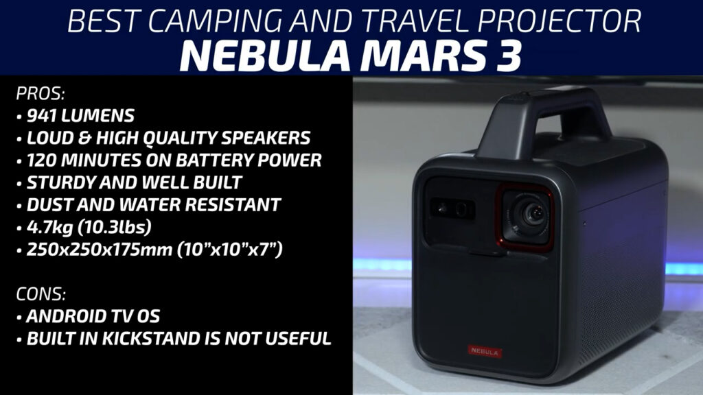 If you’re looking for something rugged to take with you while you travel or bring into the backyard, the Nebula Mars 3 is going to get my recommendation for the third year in a row. It’s got a huge built-in battery, great speakers, and is twice as bright as the TCL PlayCube with a full two hours of playback on its built-in battery. It’s also a great Bluetooth speaker. I’ve been bringing the Nebula Mars 3 on my camping trips for the last two years and I’ll continue to do so for the foreseeable future.