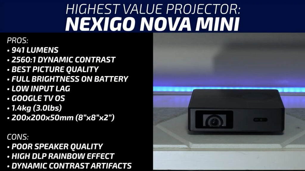 The NexiGo Nova Mini was bright, for a portable projector, had good contrast, for a portable projector, and had the best picture quality of these portable projectors. It’s currently on sale for $599, which is a reasonable price for this level of performance but while I appreciate that it maintained 100% of its brightness on battery and that the dynamic dimming system made it considerably more efficient, the speakers are not great, which seems like a big miss for a portable system. It seems like the Nova Mini would be better suited for a semi-permanent setup with a separate speaker system, which actually based on NexiGo’s marketing might have been its intended use case anyways. Aside from used and discontinued projectors, the Nova Mini is probably the best projector performance you can currently get around that $600 price point.
