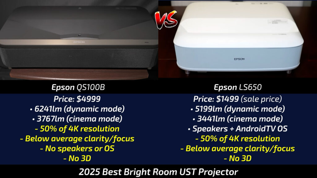 As for the Epson EF12, it is what it is. If your budget is $500 and you want a very usable short throw projector that’s easy to set up, has a long lasting laser light source, is super small, has low power draw, great speakers, and good digital zoom image shift options, the EF12 works. But don’t expect much wow factor and be prepared to play with most of your lights off.