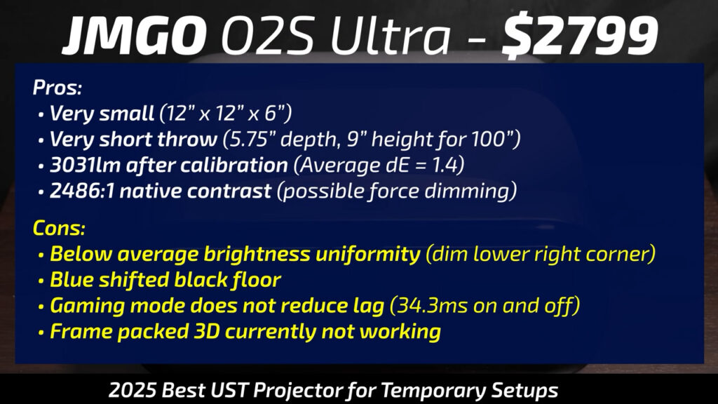 In a completely new category that I never expected this year, the JMGO O2S Ultra is the first viable portable ultra short throw that I’ve ever seen. It’s small, has a super short throw ratio, and mind-blowingly cool automatic setup features that make it possible to project onto a non-tensioned screen or white wall. The O2S Ultra was also the 3rd brightest projector after calibration with respectable native contrast and low input lag, and I’m guessing the frame packed 3D compatibility is just a bug that can be fixed easily in a firmware update.