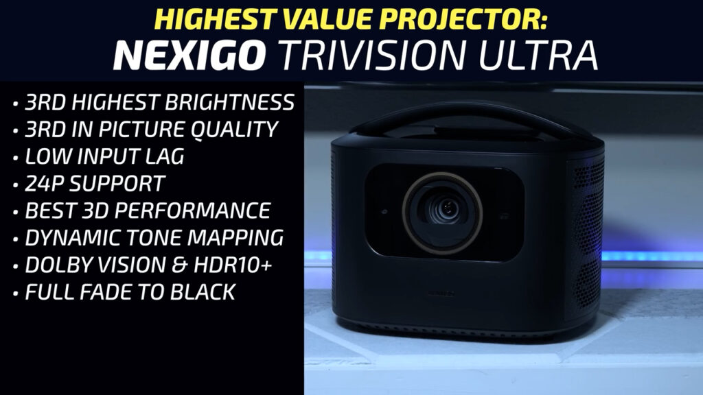 If you’re on a budget, the NexiGo TriVision Ultra currently priced at under $1300 is hands down the highest value projector on the market, with the 3rd highest usable lumens, and also finishing 3rd overall in my side-by-side testing with low input lag, 24p support, great 3D, dynamic tone mapping, Dolby Vision and HDR10+ support, and it just got a firmware update to add laser brightness controls and full fade to black. Unfortunately for the Dangbei MP1 Max, DBOX02 Pro, and BenQ GP520, the existence of the TriVision Ultra makes it really hard to recommend anything else in that $1500 and under price range unless a built-in gimbal and Google TV are on your must have list, in which case the Dangbei MP1 is probably the way to go.