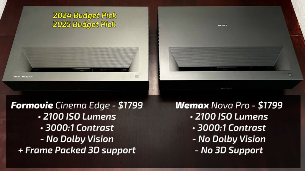 Last, the Wemax Nova Pro, which for $1799 actually performed pretty well, finishing 4th for dark room viewing with a single laser light source that’s not likely to produce laser speckle or metamerism, and a nice small compact form factor. But there’s one big problem, and that’s that the Wemax Nova Pro and Formovie Cinema Edge that I selected last year as my overall budget option, are the same projector, except the Formovie Edge got a firmware update last December that fixed its 3D compatibility and the Formovie Edge and Wemax Nova Pro are currently the same price. I’ll update the pinned comment if Wemax is able to push that same firmware fix to the Nova Pro, in which case you should just get whichever projector is less expensive, but for now the software on the Formovie Edge makes it the clear pick over the Wemax Nova Pro.
