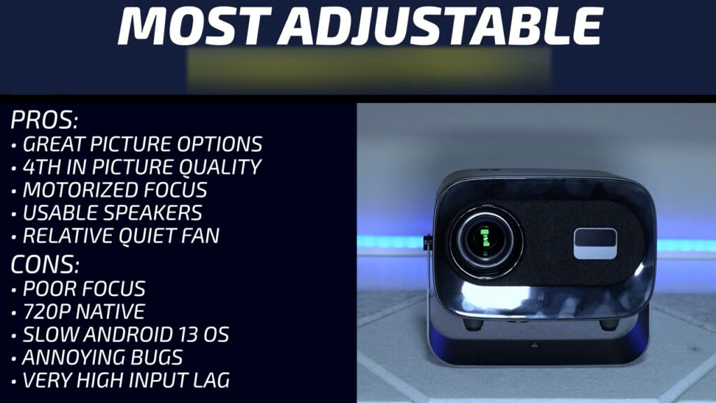 An honorable mention has to go to the Magcubic HY450 for doing something completely different.  I love the short throw and 100% offset and I think it would make a great projector for someone looking to build a budget golf simulator and would be perfect for doing projection holiday decorations. At $139, it’s the most lumens per dollar of any of the projectors in the video, but I think I’d recommend paying the extra $10 to get the NetRange version of the projector instead of the Android version like I tested. Be aware that it does have a decently loud fan at 47.2 decibels and the speakers are usable, but definitely not great.