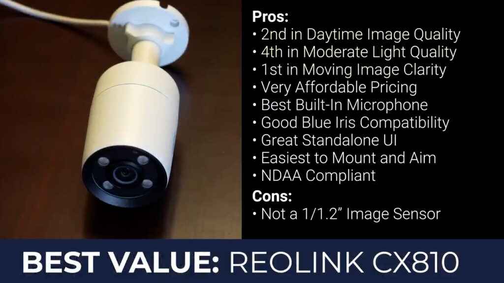 No other cameras came close to the value of the Reolink CX810, which only scored 1 point lower than the Dahua Color4K, for a price of just $109. Normally I qualify my Reolink recommendations by saying that they have issues with low light motion smearing, and that they don’t work particularly well with Blue Iris, but neither of those statements seem to apply to the CX810, and in fact it was the highest scoring camera for motion, and seemed to have the best compatibility with Blue Iris, which again, is not something I ever thought I’d say.