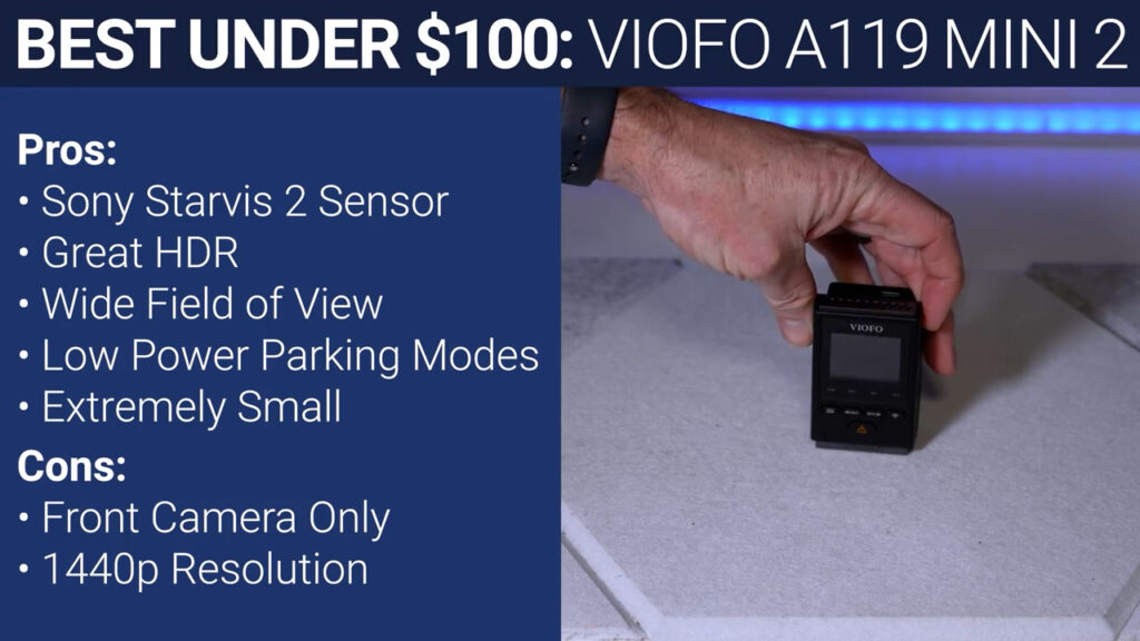 If your budget is under $100 and you’re okay with just a front facing dash cam, the Viofo A119 Mini 2 is miles ahead of other cameras in the price range and has excellent 1440p video quality with great HDR implementation, a wide field of view, good parking modes, and an incredibly compact and discrete form factor.