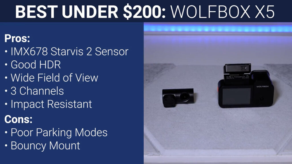 If you want more cameras, the three channel Wolfbox X5 is a crazy deal for $199 and has the same sensors and most of the same options as the $299 Vantrue N4 Pro. The Wolfbox was also the only camera that survived all 16 impacts without stopping the video feed. Its only weaknesses are fewer and less functional parking modes, weaker HDR video processing, and a mount that tends to bounce on bumpy roads leading to a bit more motion blur at night.