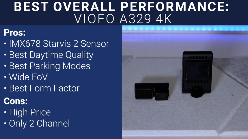 The Viofo A329 4K had the best daytime video quality, the 2nd best nighttime quality, and the best parking modes, but for $100 more than the Vantrue and twice the price of the Wolfbox, you get one less channel and marginally better performance. So, unless parking modes or one of the more niche features like USB-C SSD recording, or HDMI video output are important for you, then the Vantrue N4 Pro or Wolfbox X5 make more sense.