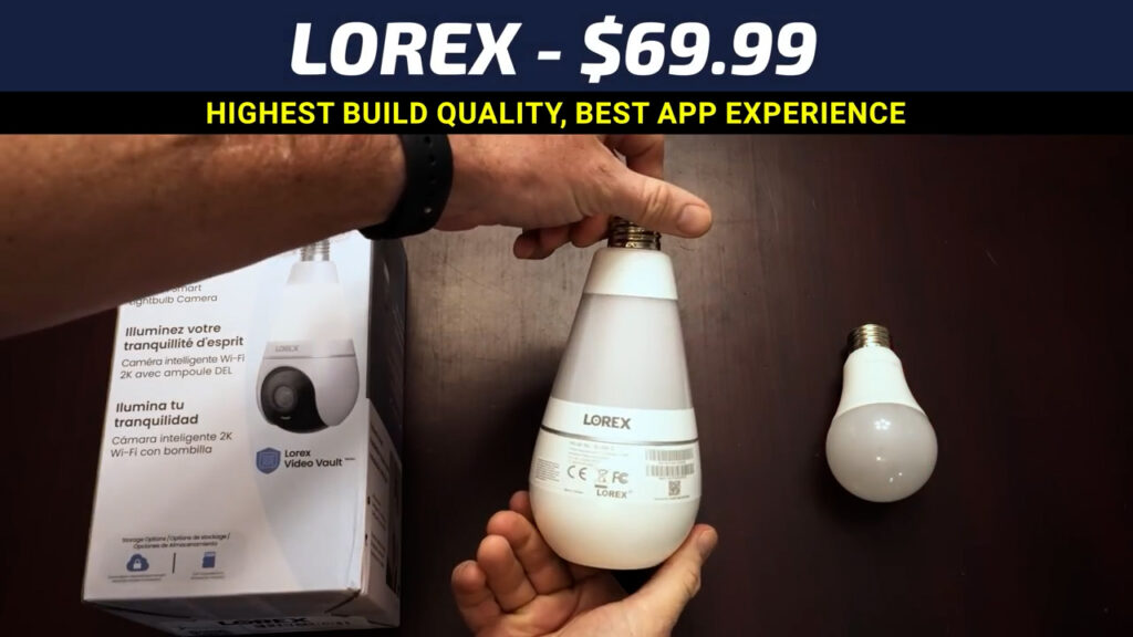 If you’re looking for something with a slightly better app and a more powerful light bulb, the Lorex was also very good with decent image quality, good light output, and a full featured app that doesn’t require a subscription but seems a bit overpriced at $70.