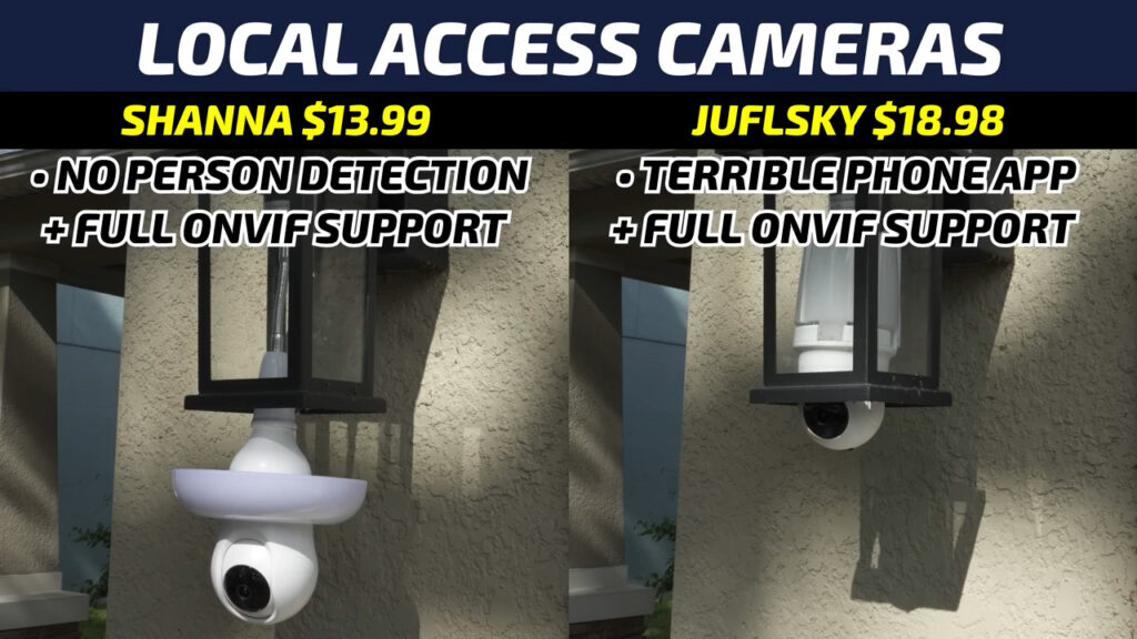 The camera that is most interesting to me is the extremely bright and aimable JUFLSKY garage style lightbulb camera. But it has issues that would stop me from recommending it to be used as an out of the box solution, namely that the JUFLSKY’s app, AJ Cloud, is legitimately terrible and has almost zero functionality if you don’t pay the monthly subscription. But the camera supports full local access and ONVIF, so if you already have an NVR, you can just use the app one time to set up ONVIF and the light timer and then never open them again.