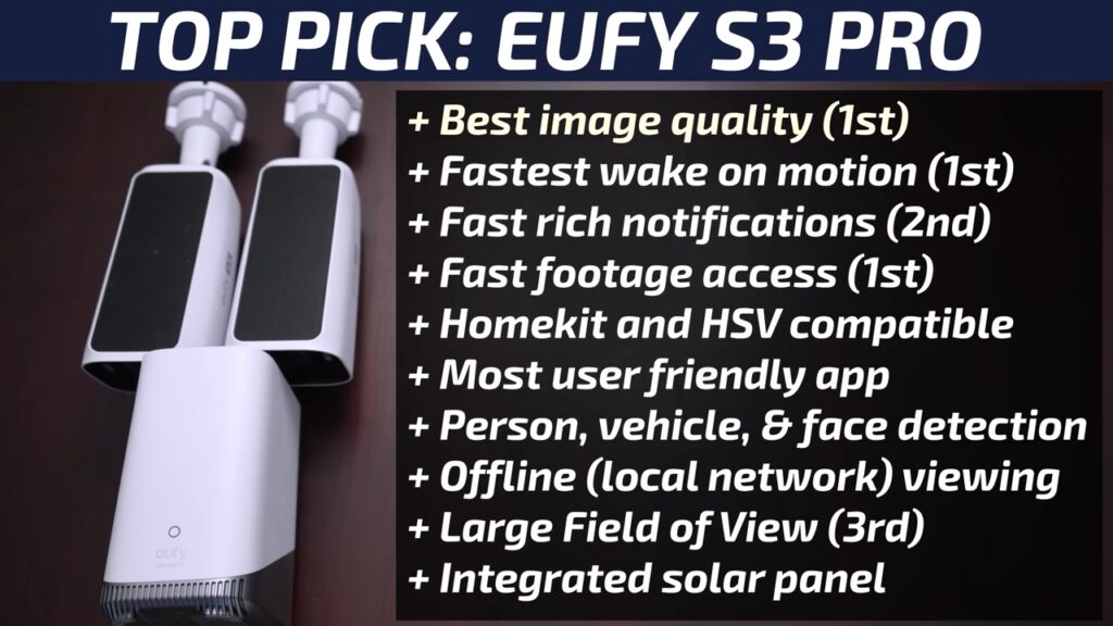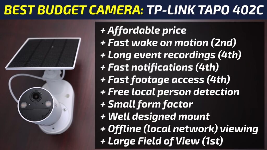 The $40 TP-Link TAPO is genuinely decent. It had the 2nd fastest motion detection time, the 4th most footage recorded, the 4th fastest notifications, the 4th fastest view time, it has person detection with no monthly fee, and if you want you can even block it from the internet and view both the live view and your recorded footage completely locally. It’s also one of the smallest overall camera and solar packages and you have the option of using the solar panel on the built in mount or moving it away from the camera for more optimal placement. The TAPO’s only real weakness is its 1080p video quality which Is definitely usable but ranked at the bottom for daytime quality, still this is an excellent deal for $40, especially if you just need a single camera.