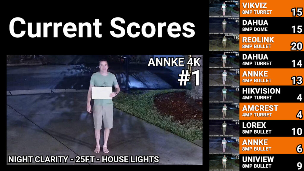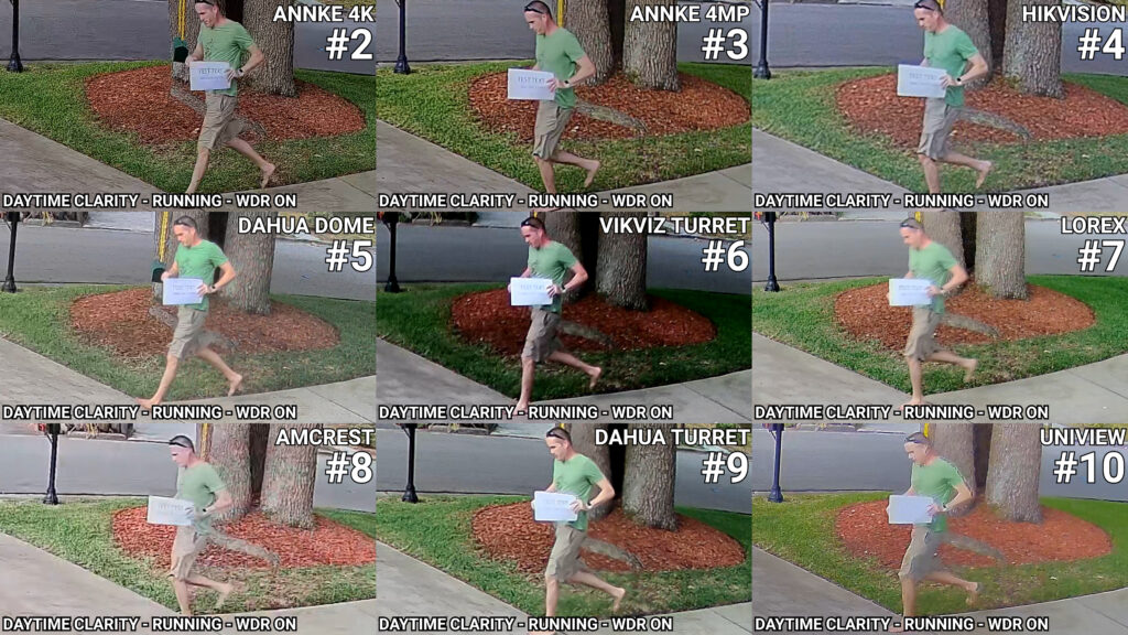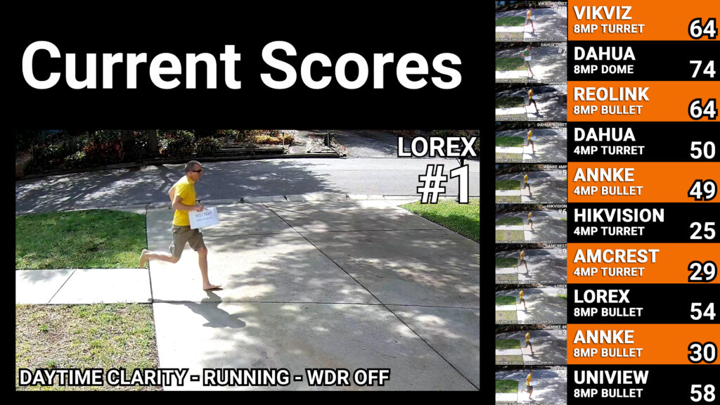 For the wide dynamic range tests, there wasn’t much to report other than the fact WDR doesn’t work very well on uniview cameras and on the reolink camera turning on WDR basically just gets it closer to a normal camera without WDR enabled, but the contrast between shadows and highlights is still extremely high. That said, I think the Reolink still produced the best image in both moving and still subjects, followed closely by the Annke 4K camera. And since there wasn’t a ton of difference in these tests verses the last, here’s how the rest of the group did in the 25 foot test, and the running test.