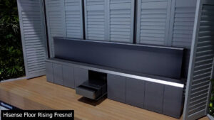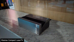 Hisense also showed off a floor rising Fresnel screen that we saw last year at CES 2024, but this time paired with a flip out version of their ultra compact laser TV. Unfortunately, according to the Hisense employee at the booth, neither the floor rising Fresnel nor built-in stand are expected to ever make it to the US market.