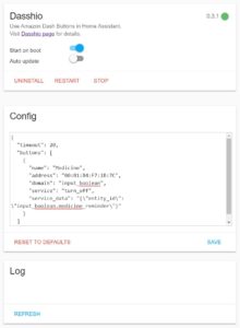 Now that dasshio is installed we’ll need to update the configuration file in the addon for our new button. Under “name” you’ll put something descriptive for your dash button, I’ll call mine “Medicine”. Under address you’ll paste in the MAC address for your button that you copied down earlier. Mac addresses are in hexadecimal, so you’ll need to add colons every two characters. For domain you’ll decide what you want to control. This could be any domain that is available under the services tab in home assistant.