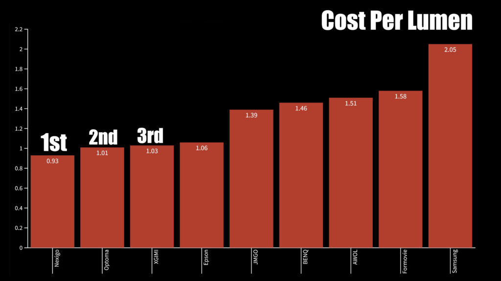 For white brightness the AWOL LTV-3500 came out on top with 3302 measured ANSI Lumens which is about 200 less than it’s advertised 3500 lumens, second the Samsung measured 3171 which is over 371 more than advertised, then the xgimi came in third with 2428, which is 28 more than advertised, I also calculated the cost per lumen where the Nexigo was by far the cheapest at 93 cents per lumen, followed by the Optoma and XGIMI at a dollar and one cent and a dollar and 3 cents respectively.