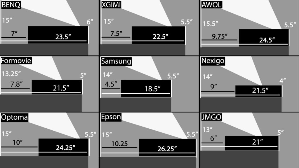 After that the JMGO needed a total of 21 inches from the screen and the Formovie and Nexigo projectors needed just a half inch more than that.