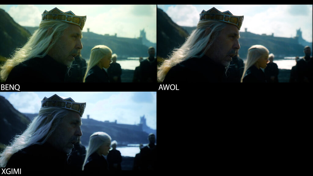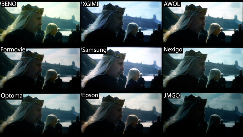 In this grouping you can see that the optoma lacks contrast, and shadow detail, especially in the king’s facial hair, is lost, and even though I really like the overall picture of the Formovie, you can see that the sharpening algorithm introduced digital noise into the black areas of the scene, so that leaves the nexigo and the awol, and between the two the nexigo appears to have slightly better black levels, and avoids the sharpening artifacts that are also present on the AWOL, but the AWOL’s brightness really makes the highlights pop and is my personal preference for the neutral color palette.