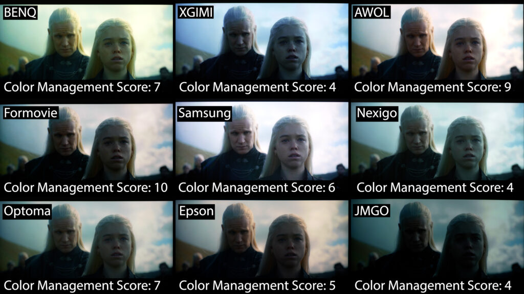 BUT as I said this kind of comparison is mostly futile, because every single one of these projectors has options for different picture modes and some of them have extremely in depth menus for tuning things like skin tone, contrast, white balance, and saturation point that the average user probably isn’t going to touch but might be important to you, so while I do think that the standard modes from xgimi and AWOL are closest to my personal preference, I think even more important than that is the ability to get your projector configured for YOUR preference so I ranked each system’s color management options from 1 to 10 with 1 being no options other than presets and 10 being full control of every aspect.