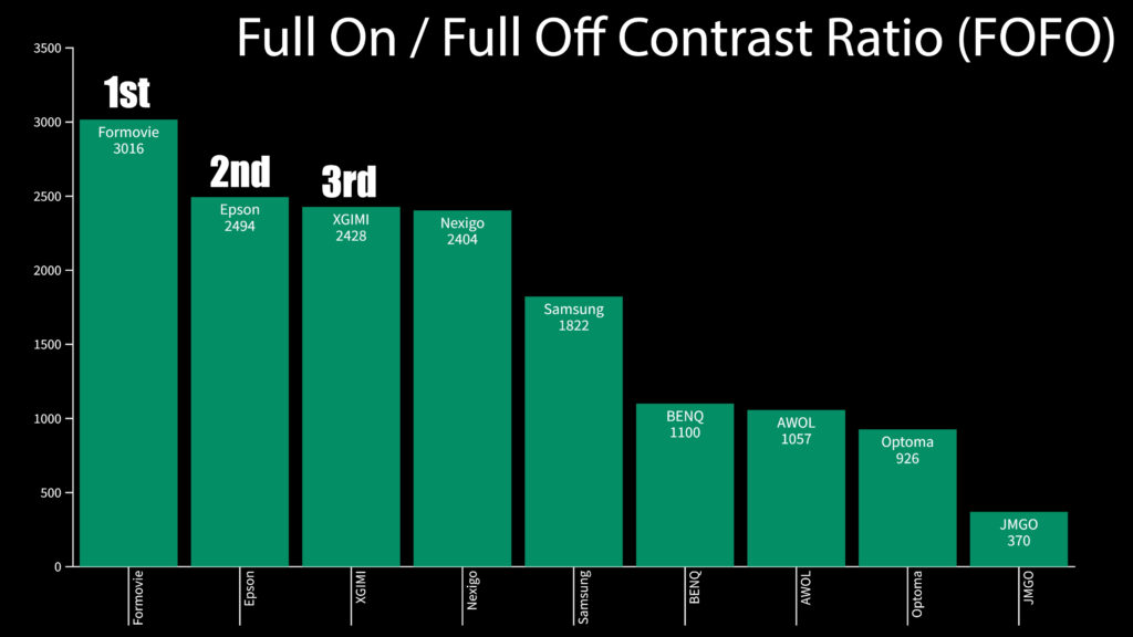 In this test the AWOL had notably low performance which is common for very bright projectors, and the contrast ratio of the JMGO was somewhat limited by it’s low white brightness, but I expected better from the Optoma P2. The best performers here were the Formovie Theater with a FOFO contrast ratio of 3616 to 1, with the Epson coming in 2nd and the Xgimi in 3rd, and those measurements directly translated into viewing experience with the Formovie, Epson and XGIMI having noticably better black levels in person.