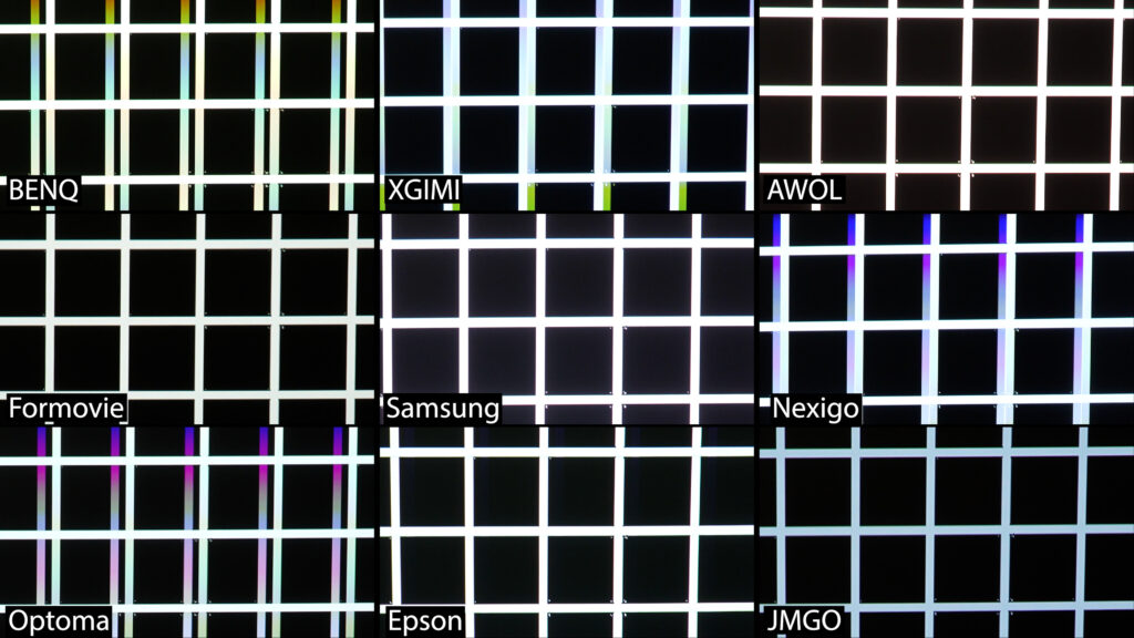 I meticulously lined up and leveled each projector to fill my projector screen without keystoning and tested their focus uniformity, and the only projectors that had any issue at all were the JMGO that was soft in the bottom left corner, the XGIMI that was just barely soft in the upper left corner, and the Nexigo that was ever so slightly out of focus in both top corners. In this test the BENQ was a standout for me and was about as perfectly uniform as you could ask for with dead sharp focus in all four corners and the center of the screen.