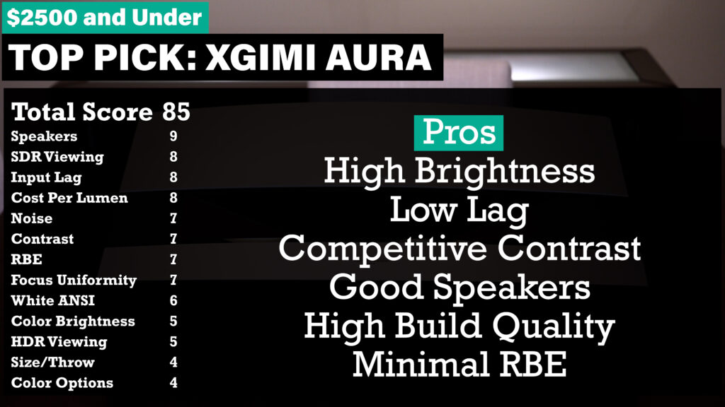 If you have $2500 to spend your options are the XGIMI Aura, Nexigo PJ90 Aurora, Epson LS300, or the Optoma P2 and even though it’s the most expensive option the XGIMI Aura is a pretty clear winner. The XGIMI has the 3rd highest overall brightness, low gaming latency, competitive black levels, good speakers, good build quality including 4 independent leveling feet and minimal RBE. The XGIMI’s only real downsides are a lack of color management options, and it’s overall size which is pretty huge.