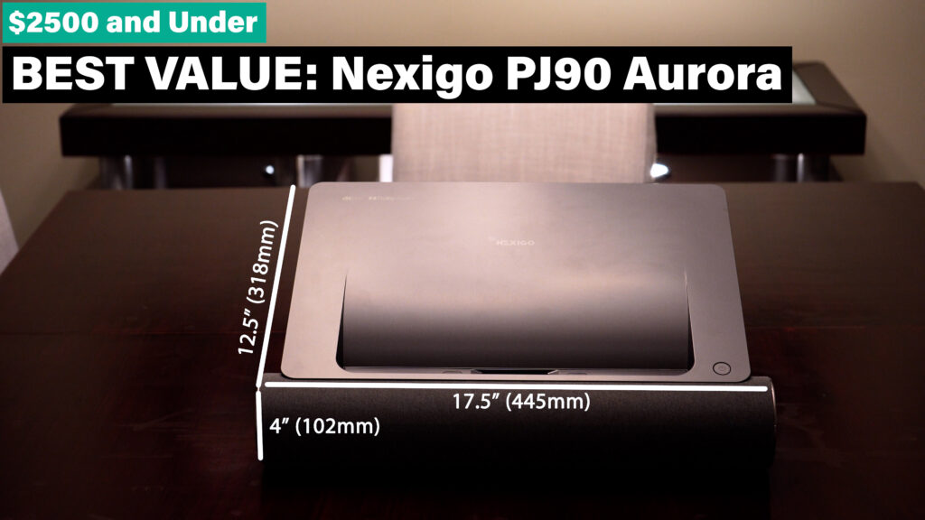 The Nexigo PJ90 Aurora is also a very interesting choice if you’re looking for a projector with a significantly smaller footprint. The XGIMI performed slightly better than the Nexigo in every category but with the Nexigo’s expected retail price of $2100 I’m not sure if the XGIMI was $400 better than the Nexigo, which has the lowest cost per lumen by a pretty significant margin.
