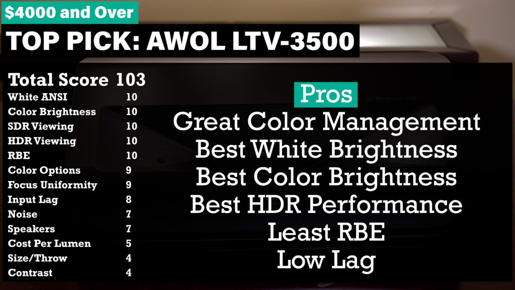 First, the high brightness comes with a tradeoff of black levels that are more dark gray then black and I also felt that for a $5000 projector the case and remote feel a little cheap. The plastic on the outside of the projector feels a little bit flimsy and the projector’s included remote looks like it belongs to a much less expensive machine. The AWOL has a built in compartment for a streaming stick which I totally appreciate, but a FireTV max feels like an odd choice for a premium projector even though it means that you won’t have to worry about the Netflix compatibility issues that are so common on AndroidTV projectors. Still overall there’s no question that the AWOL LTV-3500 was the top performing projector in this video if you’ve got the budget for it.