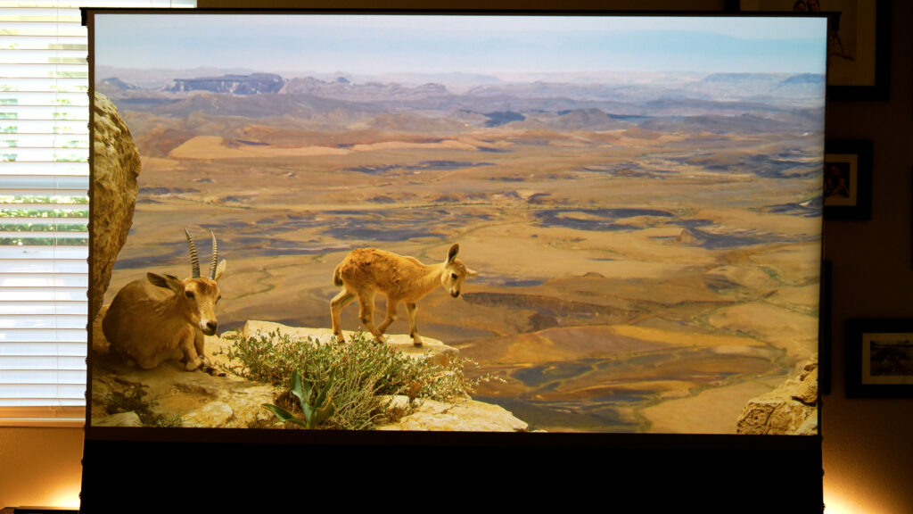 I should also mention that for testing I’m using a 100” ambient light rejecting screen from Vividstorm that is specifically designed to work with ultra short throw projectors. The vividstorm screen is textured to reflect light that originates from under the screen and reject light that comes from above the screen. We’ll talk more about the impacts of screen choice when we look at black level later on.
