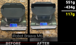 I also noticed that the Braava M6 seemed to leave the floor the wettest, so I measured the water usage for each of the robots. Starting with the easiest calculation, the Braava mop’s water tank weighed 551 grams before the mopping run and 434grams after, meaning 117mL of water ended up on the floor in a 10ft by 10ft area.