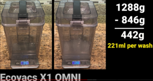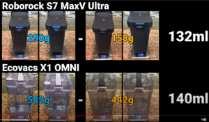 Both the Ecovacs OMNI base and the Roborock Ultra base cleaned the pads before and after the mopping run for two total cleanings and the Roborock Ultra base had 158mL of dirty water in the tank, which means roughly 79mL per cleaning while the Ecovacs OMNI base used significantly more water with 442mL in the dirty water tank, meaning it used around 221mL per wash.