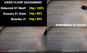 On this hard flooring test the Roborock cleaned up all 30 grams for a score of 100%, while Roomba and the Ecovacs each picked up 24g for a score of 80%. However, something I found interesting with this test was that each of the vacuums left behind a different kind debris. With the roborock there were traces of flour left over but no flax or rice, while the Roomba seemed to clean up almost all of the flour and rice, but left the flax, and the Ecovacs cleaned up everything but the rice. This is pretty surprising since the suction power on the Ecovacs X1 high compared to the Roomba J7, but I think it actually has more to do with brush design than suction.