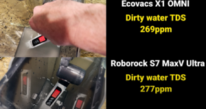 After normalizing the volume in the dirty water tanks and giving them a through mixing I measured the total dissolved solids using a TDS meter and found that the dirty water in the roborock ultra base had a TDS of 277 ppm vs 269 ppm in the X1 OMNI dirty water tank. This indicates that the Roborock Ultra base is slightly more efficient at cleaning the mopping pads, but after a physical inspection I can say that neither the X1 OMNI nor the Roborock S7 had any residual stickiness from the jelly on the pad after washing, while the microfiber pad on the Braava M6 mop was noticeably sticky to the touch.