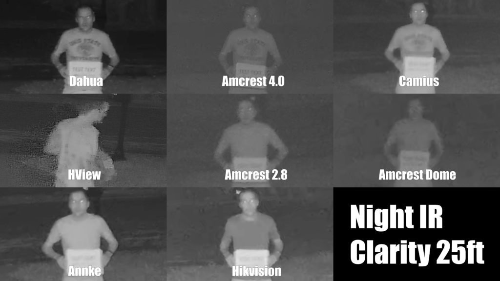 More commonly, cameras use infrared LEDs for their night vision which allows to maintain faster shutter speeds and prevent streaking. In the IR test the dahua performed the best with its large image sensor, then the 4 millimeter focal length Amcrest, then the annke, Hikvision, and the camius. You’ll also notice that the hview shot doesn’t match the rest, and that’s because for some reason I kept magically disappearing from the night time footage, probably due to errors in video compression, which leads me to my next topic.