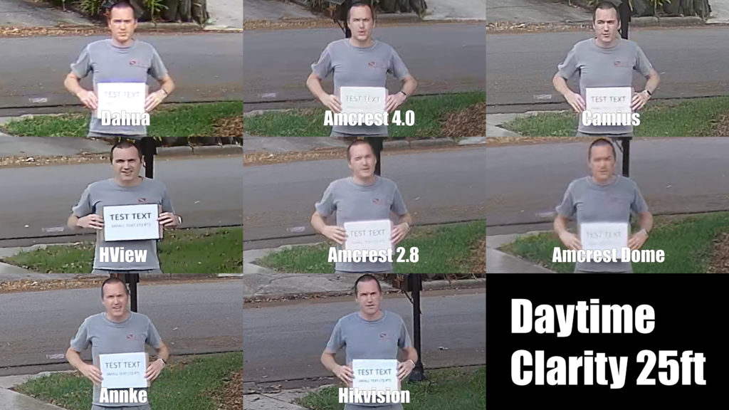 Generally speaking, we would expect cameras with a lower field of view to have a better, clearer image because each pixel needs to represent less space in the physical world, but that not always the case. To test daytime clarity I marked locations on the ground at 10 feet, 25 feet and 50 feet and I held up a sign with 150 point and 72 point font. At 25 feet the Annke and Hikvision produced the clearest images. It’s tempting to say that the hview image is the best if you only consider the 150 point font, but the 72 point font is definitely more legible with the Annke and Hikvision, not to mention the hview is distorted due to it using a 4:3 image sensor to produce a 16:9 widescreen image. You can also see the downfall of varifocal cameras here where some chromatic aberration is visible in the dahua image, in fixed focal length cameras the lens is tuned for one specific focal length, but a varifocal lens needs to be able to be adjusted, meaning it might not always be in a sweet spot. All things considered though, the dahua image is actually REALLY good considering how wide the field of view it has, and it doesn’t suffer from the field of view and clarity trade off visible with the Amcrest dome, which struggled to produce legible image of the 150 point font from just 25 feet.