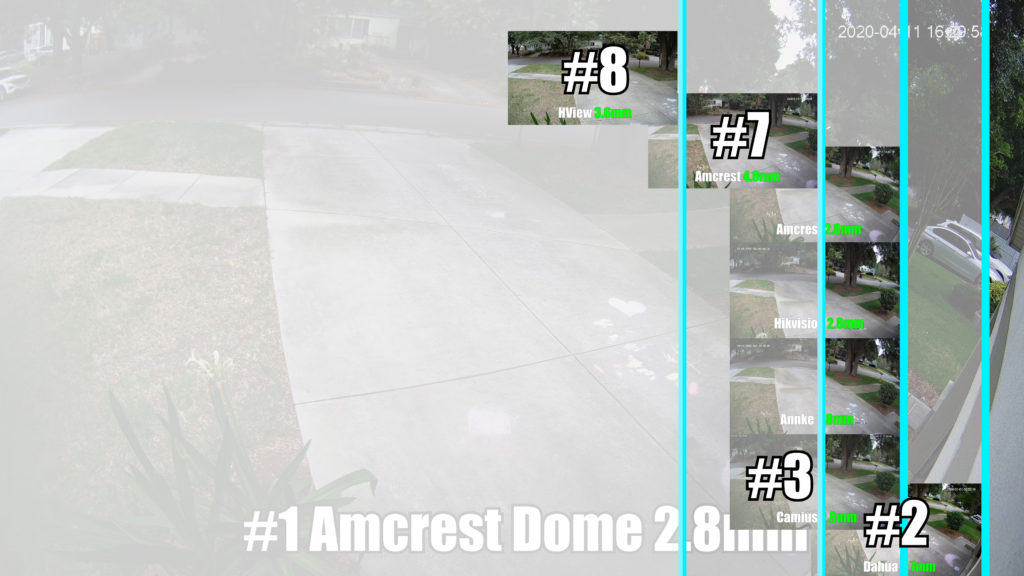 To get a feeling for each camera’s field of view I attempted to line up the left side of the image with the corner of the sidewalk so I could compare how far into my neighbors yard the right side would reach. You can see that the Amcrest dome camera had the greatest field of view, even though it has the same 2.8mm focal length as some of the other cameras, and the dahua had the second largest field of view even though it’s minimum focal length is 3.7mm. This suggests that the Dahua has a significantly larger image sensor than the rest of the cameras, which also becomes evident in our nighttime footage later on. You can see that the least expensive camera, the hview, has roughly the same focal length as the Dahua, but the lowest field of view, indicating a significantly smaller image sensor, which is somewhat expected considering the dahua is the most expensive cameras and the hview is the cheapest.