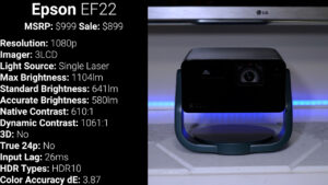 Starting with the least expensive projector, the Epson EF22 is a 1080p lifestyle projector with an MSRP of $999 and a common sale price of $899. Epson claims the single laser light source of the EF22 has a brightness of 1000 ISO lumens, and in my testing using the ANSI standard where you measure the brightness at nine separate points and multiply the average brightness by the screen size in square meters, the Epson exceeded its brightness claim by roughly 10% with 1104 lm on Dynamic mode, but only 641 lumens on Vivid mode. On its most color accurate mode, the EF22 measured just 63.7 nits, which is equivalent to around 580 lumens with a black floor of 0.104 nits giving it a native contrast ratio of 610:1 in Cinema mode, which isn’t great, but on Dynamic mode the peak brightness increased significantly to 117.8 nits without raising the black floor resulting in a much better contrast ratio of 1061:1.