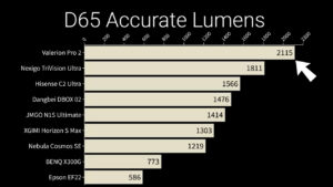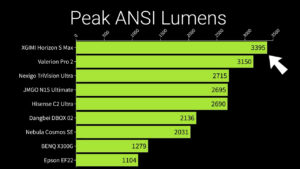And that means that overall, the brightest projectors using high power modes with low color accuracy were the XGIMI with 3395 ANSI lumens, the Valerion with 3150 ANSI lumens, and the Nexigo with 2715 ANSI lumens.