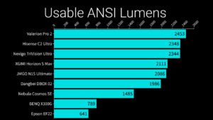 But most people will not end up using those modes, and when looking at their usable brightness, the Valerion VisionMaster Pro2 was in first with 2453 ANSI lumens, the Hisense C2 Ultra came in second with 2348 ANSI lumens, and the Nexigo TriVision Ultra was in third with 2344 ANSI lumens.