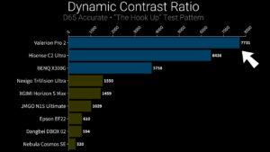 For native contrast with no dynamic dimming, the BENQ X300G came out on top with 1827:1 due to using a larger 0.65” DLP chip, Valerion was in second with 1723:1, and the Hisense C2 Ultra was in third measuring 1688:1.