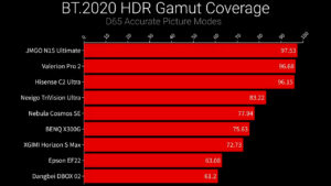 And for the widest BT2020 color space, the JMGO Malc triple laser setup came out on top with 97.53% coverage, followed closely by the triple lasers from Valerion and Hisense, then the hybrid Nexigo, and the rest of the projectors were below 80% BT2020 coverage.