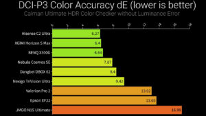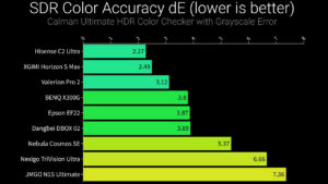 When looking at color accuracy, I profiled my C6 colorimeter with my JETI 1501 high res spectroradiometer and then used Calman Ultimate SDR color checker to measure each projector’s out of the box Delta Error and I found that most of the projectors were surprisingly accurate. Any delta error under 3 is generally regarded as the point where the naked eye can’t tell the difference between two colors, meaning the Hisense C2 Ultra and XGIMI Horizon S Max were exceptionally accurate, but the Valerion, BENQ, Epson and Dangbei were also under 4, which is still surprisingly good.